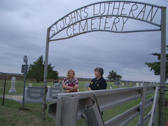 Kellie Koch Kjos hosted the event. Ms. Kjos is the great granddaughter of Jacob and Amalia Koch who donated the land for the cemetery. Ron Schneider provided the invocation with Scotty Schilling, County Commissioner, spoke of the history of the cemetery and related a historical perspective on how cemetery's originated and funeral rituals began. Ervin Koch and Linda Weiderstein unveiled the historical marker. Mr. Koch is the grandson of Jacob and Amalia and Ms. Weiderstein is the youngest daughter of the Kochs. Dorothy Schoenhals read the historical description to the group of over 60 who attended the afternoon event. The St. John's Cemetery was started in 1916 when Jacob and Amalia Koch allowed church members to bury family members on their land. The land was finally deeded to the church in 1950. The first burial was baby Hildegard Schilling, January 11, 1916. Three other Schilling children were buried in the next six years. There are fifteen children's burials in the cemetery during the 1920's and the depression years of the 1930's. These deaths reflect the hard times suffered by the early Lipscomb settlers. Fiels, Herbers, Kappel, Koch, Meller, Stable, Babitzke are some of the many German Russian names marked on the tombstones. Victor Born, a charter member of the Church, made the welded iron name of the cemetery in approximately 1949. There are 94 graves in the beautiful rural cemetery and each grave has a permanent marker. The Lipscomb County Historical Commission volunteers, Dorothy Schoenhals and LaVaun Kraft contact family members and other parties to solicit funds to ensure that all unmarked graves receive a marker. Contact the museum or these ladies if you are interested in the cemetery project. The designation of a Historic Texas cemetery is reserved for cemeteries that are at least 50 years old and are deemed worthy of recognition for its historical association. St. John's is the fourth Lipscomb County Cemetery to have its marker dedicated. Six cemeteries have received historic designation with Viewpoint and Heart to receive markers in 2007. The last three cemeteries will be finished in 2007-2008. The event was part of a Koch family reunion held in Lipscomb. |